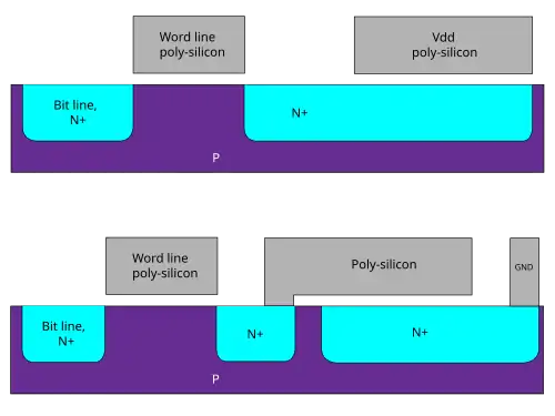 A schematic drawing depicting the cross-section of the original one-transistor, one-capacitor NMOS DRAM cell. It was patented in 1968.