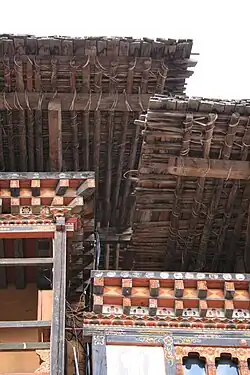 The roofs are massively constructed in hardwood and bamboo, highly decorated at the eaves, and are constructed traditionally without the use of nails. They are open at the eaves to provide a ventilated storage area. They were traditionally finished with timber shingles weighted down with stones; but in almost all cases this has now been replaced with corrugated galvanised iron roofing. The roof of Tongsa Dzong, illustrated, is one of the few shingle roofs to survive and was being restored in 2006–07.