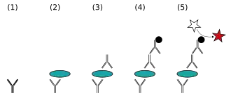 - A specific antibody is added, and binds to antigen (hence the 'sandwich': the antigen is stuck between two antibodies). This primary antibody could be in the serum of a donor, to be tested for reactivity towards the antigen.