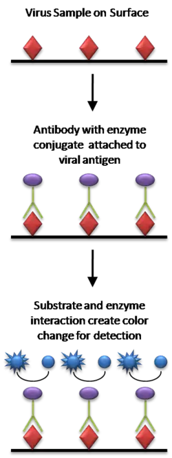 In the most simple form of an ELISA, antigens from the sample to be tested are attached to a surface. Then, a matching antibody is applied over the surface so it can bind the antigen. This antibody is linked to an enzyme, and then any unbound antibodies are removed. In the final step, a substance containing the enzyme's substrate is added. If there was binding, the subsequent reaction produces a detectable signal, most commonly a color change.
