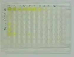 ![]() An ELISA being developed with TMB substrate for horseradish peroxidase-linked secondary antibody | |