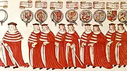 The royal procession to the Parliament of England at Westminster on 4 February 1512. Left to right: The Marquess of Dorset (second from left), Earl of Northumberland, Earl of Surrey, Earl of Shrewsbury, Earl of Essex, Earl of Kent, Earl of Derby, Earl of Wiltshire. From Parliament Procession Roll of 1512.