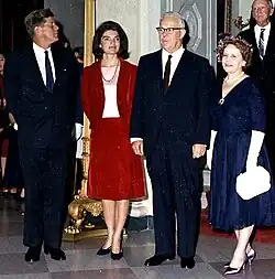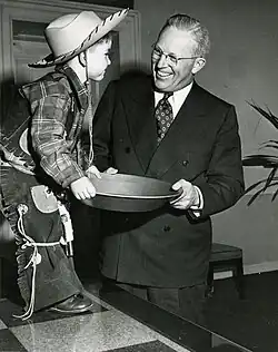 Though he considered retiring after two terms, Warren ultimately chose to seek re-election in 1950, partly to prevent the more conservative Knight from succeeding him. He easily won the Republican primary, but was defeated in the Democratic primary by James Roosevelt.[77] Warren consistently led Roosevelt in general election polls and won re-election in a landslide, taking 65 percent of the vote.[78] He was the first Governor of California elected to three consecutive terms.[67] During the 1950 campaign, Warren refused to formally endorse Richard Nixon, the Republican nominee for the Senate. Warren disliked what he saw as Nixon's ruthless approach to politics and was wary of having a conservative rival for leadership of the state party. Despite Warren's refusal to campaign for him, Nixon defeated Democratic nominee Helen Gahagan Douglas by a decisive margin.[79]