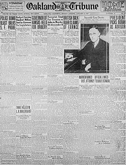 The Great Depression hit the San Francisco Bay area hard in the 1930s, leading to high levels of unemployment and a destabilization of the political order.[21] Warren took a hard stance against labor in the buildup to the San Francisco General Strike. In Whitney v. California (1927) Warren prosecuted a woman under the California Criminal Syndicalism Act for attending a communist meeting in Oakland.[22] In 1936, Warren faced one of the most controversial cases of his career after George W. Alberts, the chief engineer of a freighter, was found dead. Warren believed that Alberts was murdered in a conspiracy orchestrated by radical left-wing union members, and he won the conviction of union officials George Wallace, Earl King, Ernest Ramsay, and Frank Conner. Many union members argued that the defendants had been framed by Warren's office, and they organized protests of the trial.[23]