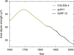 The direction and intensity of the dipole change over time. Over the last two centuries the dipole strength has been decreasing at a rate of about 6.3% per century.[13] At this rate of decrease, the field would be negligible in about 1600 years.[35] However, this strength is about average for the last 7 thousand years, and the current rate of change is not unusual.[36]