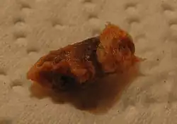 There are two genetically-determined types of earwax: the wet type, which is dominant, and the dry type, which is recessive. This distinction is caused by a single base change in the "ATP-binding cassette C11 gene". Dry-type individuals are homozygous for adenine (AA) whereas wet-type requires at least one guanine (AG or GG).[6] Dry earwax is gray or tan and brittle, and is about 20% lipid.[5] It has a smaller concentration of lipid and pigment granules than wet earwax.[5] Wet earwax is light brown or dark brown and has a viscous and sticky consistency, and is about 50% lipid.[5] Wet-type earwax is associated with armpit odor, which is increased by sweat production.[6][7]
