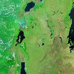 Image of the region between Lake Victoria (on the right) and Lakes Edward, Kivu and Tanganyika (from north to south) showing dense vegetation (bright green) and fires (red)