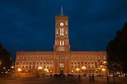 The legislature of East Berlin was the City Assembly of Deputies (German: Stadtverordnetenversammlung) (SVV), which had 130 members elected every five years alongside the Volkskammer and the legislatures of the other Bezirke of East Germany.[11] The assembly met in the Red City Hall, which also housed the Magistrate of East Berlin. The actual significance of the assembly was little, the assembly being in session only a few times per year too unanimously approve decisions made by the SED and the Magistrate.