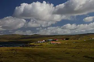 The northern part of the island, apart from the coastal strip bordering the Choiseul Sound, is largely underlain by Palaeozoic rocks in the form of quartzite and slate, which tend to form rugged landscapes and coastlines and to cause the soil to be poor and acidic.[4] The principal range of hills, the 600 m (2,000 feet) Wickham Heights, runs from east to west.[5] The highest point of the range (also the highest point in the Falklands) is Mount Usborne which has a height of 705 m (2,313 ft).[6] The area away from the mountain range consists chiefly of low undulating ground, a mixture of pasture and morass, with many shallow freshwater tarns, and small streams running in the valleys. Two inlets, Berkeley Sound and Port William, run far into the land at the north-eastern extremity of the island and provide anchorage for shipping.