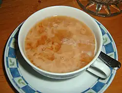 The tea is not only a kind of beverage for the population, but also part of its cultural tradition. Over the years the region developed a unique tea ceremony that can be strictly observed in older households. As a part of these rules, the oldest woman in the round has to serve the other guests with tea, starting with the second oldest and then going down in age regardless of gender. The "kluntje" must be placed inside the teacup before the tea is poured right on top of it. After that some heavy cream is added carefully just as a top layer so it can make "clouds" (wulkjes) that swim on the tea itself. It's then forbidden to stir the tea, so the layers stay mild, strong and then sweet from top to bottom.[8] Depending on the area of East Frisia, the tea can also be poured out of the cup into its saucer and drunk from there. If you don't want any more tea, you have to put your spoon into the cup or else the host will refill your cup immediately after everyone in the round finished their current cup of tea.