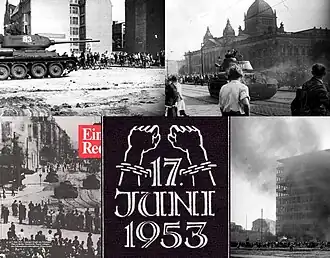 From top to bottom, left to right: Soviet tanks suppress unarmed civilians on Schützenstrasse in Berlin · in front of the Dimitrov Museum in Leipzig · on Leipziger Strasse in Berlin · Deutsche Bundespost commemorative stamp · Burning building on Potsdamer Platz