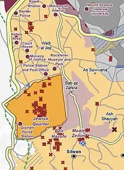 In 1934, the British Mandatory authorities divided Jerusalem into 12 wards for electoral purposes. The mapping was criticized by those who believed it was drawn to ensure a Palestinian majority on the Jerusalem city council. The actual mapping suggests otherwise, according to Michael Dumper, who states that the peculiar "hook" on the western electoral borders was a gerrymander made to include as many new Jewish neighbourhoods on that side as possible, while keeping outside of the boundaries Arab villages. To the east, the city's border ended at the Old City walls, in order to exclude the contiguous Arab neighbourhood of Silwan, Ras al-Amud and At-Tur and Abu Tor. These boundaries defined the municipality down to 1948.[31] By 1947 Palestinian Arabs constituted a majority overall in the Jerusalem district, but Jews predominated within the British municipal boundaries, 99,000 to 65,100 Arabs.[32] The Jewish presence in eastern Jerusalem was concentrated to the Old Quarter, with a scattering also present in Silwan and Sheikh Jarrah.[33]
