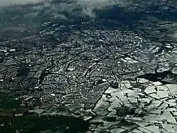 East Kilbride grew from a small village of around 900 inhabitants in 1930 to become a large burgh in 1967.[18] The rapid industrialisation of the 20th century underpins this growth and left much of the working population throughout Scotland's Central Belt, from Glasgow to Edinburgh, living in the housing stock built at the end of the previous century. The Great War postponed any housing improvements, as did the Treaty of Versailles and the period of post-war settlement it created. In turn, this was followed by the Great Depression. After the Second World War, Glasgow, already suffering from chronic housing shortages, incurred bomb damage from the war. In 1946, the Clyde Valley Regional Plan allocated sites where overspill satellite "new towns" could be constructed to help alleviate the housing shortage.[19] Glasgow would also undertake the development of its peripheral housing estates. East Kilbride was the first of six new towns in Scotland to be designated, in 1947, followed by Glenrothes (1948), Cumbernauld (1956), Livingston (1962), Irvine (1964) and Stonehouse (1972), although Stonehouse new town was never built.[20][21]