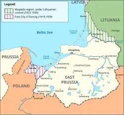 ![]() East Prussia (red), within the Free State of Prussia (blue), within the borders of Interwar Germany, between 1919 and 1938 | |||||||||||||||||||