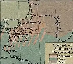 At the instigation of Duke Konrad I of Masovia, the Teutonic Knights took possession of Prussia in the 13th century and created a monastic state to administer the conquered Old Prussians. Local Old-Prussian (north) and Polish (south) toponyms were gradually Germanised. The Knights' expansionist policies, including occupation of Polish Pomerania with Gdańsk/Danzig and western Lithuania, brought them into conflict with the Kingdom of Poland and embroiled them in several wars, culminating in the Polish-Lithuanian-Teutonic War, whereby the united armies of Poland and Lithuania, defeated the Teutonic Order at the Battle of Grunwald in 1410. In 1440, the anti-Teutonic Prussian Confederation was founded, and various cities and nobles of the region joined it.[5] In 1454, upon the Confederation's request King Casimir IV of Poland signed the act of incorporation of the entire region into the Kingdom of Poland.[6] The Teutonic Knights' defeat was formalised in the Second Peace of Thorn in 1466 ending the Thirteen Years' War. The restoration of Pomerelia to Poland was confirmed, and Warmia also was confirmed part of Poland,[7] with both co-forming the newly created autonomous province of Royal Prussia (from 1569 within the larger Greater Poland Province). The remainder of historic Prussia (the bulk of the territory that later formed East Prussia) also became a part of "one and indivisible" Kingdom of Poland as a fief and protectorate held by the Teutonic Knights.[8] 1466 and 1525 arrangements by kings of Poland were not verified by the Holy Roman Empire, as well as the previous gains of the Teutonic Knights, were not verified.