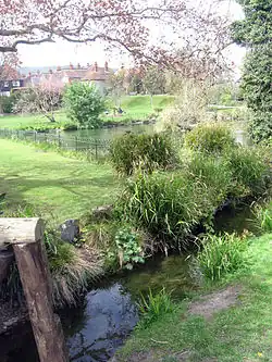 The original name came from the 'Burne' or stream which ran through today's Old Town area of Eastbourne. All that can be seen of the Burne, or Bourne, is the small pond in Motcombe Gardens. The bubbling source is guarded by a statue of Neptune.[13] Motcombe Gardens are overlooked by St. Mary's Church, a Norman church which allegedly lies on the site of a Saxon 'moot', or meeting place. This gives Motcombe its name.