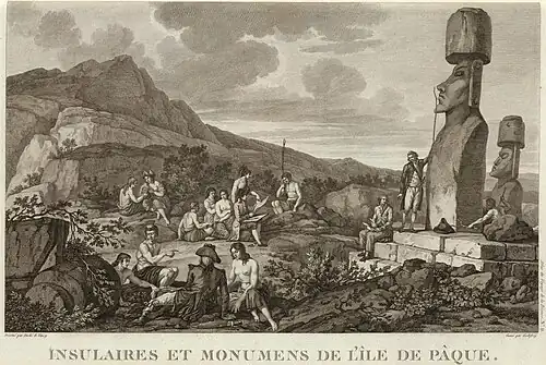 On April 10, 1786, French Admiral Jean-François de Galaup, comte de Lapérouse anchored at Hanga Roa at the start of a circumnavigation of the Pacific. He made a detailed map of the bay, including his anchorage points, as well as a more generalised map of the island, plus some illustrations.[58]