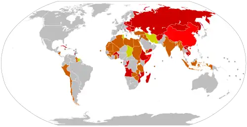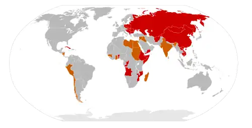Countries which once had overtly Marxist–Leninist governments in bright red and countries the USSR considered at one point to be "moving toward socialism" in orange