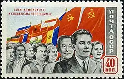 1950 Soviet stamp, depicting the flags and peoples of communist states at the time, including those of Eastern Europe