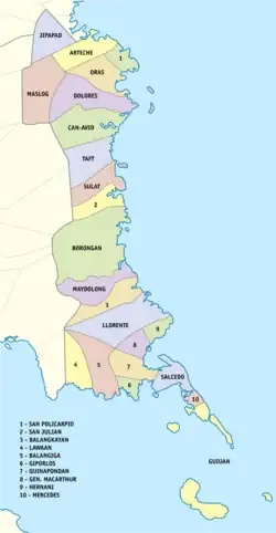 Eastern Samar comprises 22 municipalities and one city, all encompassed by an lone congressional district and two provincial districts that elect a representative and provincial board members, respectively.