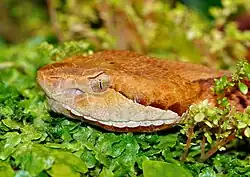 Although venomous, eastern copperheads are generally not aggressive and bites are rarely fatal.[40] Copperhead venom has an estimated lethal dose around 100 mg, and tests on mice show its potency is among the lowest of all pit vipers, and slightly weaker than that of its close relative, the cottonmouth.[41] Copperheads often employ a "warning bite" when stepped on or agitated and inject a relatively small amount of venom, if any at all. "Dry bites" involving no venom are particularly common with the copperhead, though all pit vipers are capable of a dry bite.[42] The fangs of dead pit vipers are capable of delivering venom in amounts that necessitate the use of antivenom.[43]
