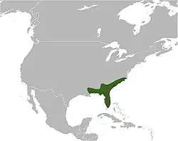 The eastern diamondback rattlesnake is found in the Southeastern United States from southeastern North Carolina, south along the coastal plain through peninsular Florida to the Florida Keys, and west along the Gulf Coast through southern Alabama and Mississippi to southeastern Louisiana. The original description for the species does not include a type locality, although Schmidt (1953) proposed it be restricted to "Charleston, South Carolina" (USA).[3]