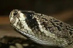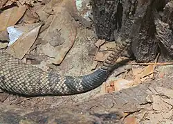 Other common names for this snake species include eastern diamond-backed rattlesnake,[6] eastern diamondback,[5] diamond rattlesnake, diamond-back rattlesnake, common rattlesnake, diamond-back, diamond(-patch) rattler, eastern diamond-back (rattlesnake), eastern diamond rattlesnake, Florida diamond-back (rattlesnake), Florida rattlesnake, lozenge-spotted rattlesnake, rattler, rattlesnake, southeastern diamond-backed rattlesnake, southeastern diamond-backed rattler, southern woodland rattler, timber rattler, water rattle, water rattlesnake,[18] and diamondback rattlesnake.[4]