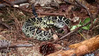 Eastern diamondback rattlesnakes (Crotalus adamanteus, EDB) have limited ability to adapt to habitat loss and fragmentation due to the species' slow life history, high habitat specificity, and minimal dispersal ability.[31] Threats to eastern diamondback rattlesnake include habitat loss, killing by humans, and highway mortality. Rattlesnake roundups are another threat to this species, as they are removed from the wild and killed for exhibition and entertainment. One common method of capture at these events involves pouring gasoline down a rattlesnake's supposed burrow, a practice which is harmful to both the snake and its environment.[32] A study was conducted in South Carolina that showed positive results in translocating species to save them due to their inability to adapt to habitat loss.[33]