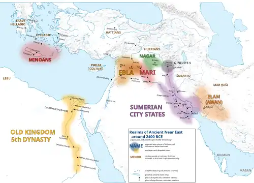 Mardikh I is followed by the first and second kingdoms era between about 3000 and 2000 BC, designated "Mardikh II".[11] I. J. Gelb considered Ebla a part of the Kish civilization, which was a cultural entity of East Semitic-speaking populations that stretched from the center of Mesopotamia to the western Levant.[12]