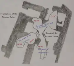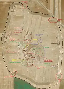 Ebla consisted of a lower town and a raised acropolis in the center.[117] During the first kingdom, the city had an area of 56 hectares and was protected by mud-brick fortifications.[118] Ebla was divided into four districts – each with its own gate in the outer wall.[119] The acropolis included the king's palace "G",[120] and one of two temples in city dedicated to Kura (called the "Red Temple").[121] The lower city included the second temple of Kura in the southeast called "Temple of the Rock".[122] During the second kingdom, a royal palace (Archaic palace "P5") was built in the lower town northwest of the acropolis,[85] in addition to temple "D" built over the destroyed "Red Temple".[123]