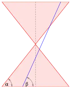 - ^ The limiting eccentricity of a degenerate conic that is a double line is 1, as the limit of an ellipse with the ratio of the semi-minor to semi-major axis approaching zero (), the eccentricity . This is also the case for the limit of a hyperbola with , where the eccentricity . However, the limiting eccentricity of a degenerate conic that is a pair of intersecting lines is , where is the angle between the lines. is infinity when . This can be seen by considering the hyperbola whose asymptotes are the intersecting lines . The angle between the asymptotes is given by . The eccentricity of the hyperbola is . As the hyperbola degenerates to its asymptotes, the eccentricity remains .