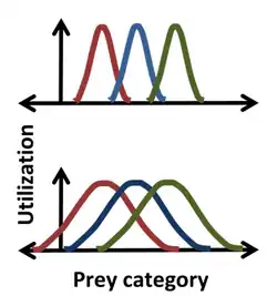 Statistics were introduced into the Hutchinson niche by Robert MacArthur and Richard Levins using the 'resource-utilization' niche employing histograms to describe the 'frequency of occurrence' as a function of a Hutchinson coordinate.[2][21] So, for instance, a Gaussian might describe the frequency with which a species ate prey of a certain size, giving a more detailed niche description than simply specifying some median or average prey size. For such a bell-shaped distribution, the position, width and form of the niche correspond to the mean, standard deviation and the actual distribution itself.[22] One advantage in using statistics is illustrated in the figure, where it is clear that for the narrower distributions (top) there is no competition for prey between the extreme left and extreme right species, while for the broader distribution (bottom), niche overlap indicates competition can occur between all species. The resource-utilization approach postulates that not only can competition occur, but that it does occur, and that overlap in resource utilization directly enables the estimation of the competition coefficients.[23] This postulate, however, can be misguided, as it ignores the impacts that the resources of each category have on the organism and the impacts that the organism has on the resources of each category. For instance, the resource in the overlap region can be non-limiting, in which case there is no competition for this resource despite niche overlap.[1][20][23]