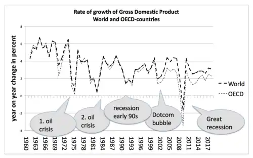Economic growth in the United States slowed down after 1973.[32] In contrast, growth in Asia has been strong since then, starting with Japan and spreading to Four Asian Tigers, China, Southeast Asia, the Indian subcontinent and Asia Pacific.[33] In 1957 South Korea had a lower per capita GDP than Ghana,[34] and by 2008 it was 17 times as high as Ghana's.[35] The Japanese economic growth has slackened considerably since the late 1980s.