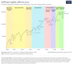 The end of the civil wars provided the political and legal stability necessary to assert property rights and cut transaction costs, contributing to the huge inflows of capital and labor resources that built modern Argentina.[52] In 1866 an attempt was made to stabilize the currency, by introducing a system of convertibility,[53] which restricted the monetary authorities to issue paper currency only if it was fully backed by gold or convertible foreign currency.[44] The decades of the 1860s and 1880s experienced the most favorable performance of the economy overall, setting the stage for the so-called Golden Age of Argentine history.[54] Nevertheless, the first years of independence included a difficult economic development. In spite of the new freedom caused by the inauguration of the republic, the country was not economically united: expansion in some parts and decline in other parts. Indeed, people experienced different levels of income and welfare. Therefore, it is unclear whether 1820–1870 brought an income or welfare improvement.[55]