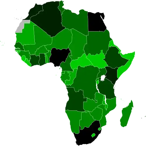 African countries suffer from communication difficulties caused by language diversity. Greenberg's diversity index is the chance that two randomly selected people would have different mother tongues. Out of the most diverse 25 countries according to this index, 18 (72%) are African.[93] This includes 12 countries for which Greenberg's diversity index exceeds 0.9, meaning that a pair of randomly selected people will have less than 10% chance of having the same mother tongue. In addition, the primary language of government, political debate, academic discourse, and administration is often the language of the former colonial powers, English, French, Arabic, or Portuguese, which many do not speak.
