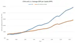 After a decade of impressive growth rates, Chile began to experience a moderate economic downturn in 1999, brought on by unfavorable global economic conditions related to the 1997 Asian financial crisis. The economy remained sluggish until 2003, when it began to show clear signs of recovery, achieving 4.0% real GDP growth.[45] The Chilean economy finished 2004 with growth of 6.0%. Real GDP growth reached 5.7% in 2005 before falling back to 4.0% in 2006. GDP expanded by 5.1% in 2007. In recent years, more stable macroeconomic conditions have replaced Chile's post- pandemic turmoil. A 2.4 % real GDP growth in 2024 was attributed to rising household income and rebounding investment, according to the OECD (2025). Inflation dropped sharply from 12 % in 2023 to 4.3 % in 2024, approaching the Central Bank's target range. Mining continues to dominate the external industry, accounting for almost 60% of export earnings. Due to the global demand for battery materials, lithium output increased significantly in 2024 while copper production increased by 2.8%. Despite strong export success, productivity is still a structural challenge because worker output is roughly 50% below the OECD average. Public debt rose to 38 percent of GDP in 2024, reflecting long- term fiscal pressures and relatively low tax revenues. Policy discussions increasingly focus on diversification, female labor-force participation, and regulatory reforms to enhance productivity and sustain inclusive growth. [46]