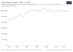 France has a highly developed social market economy with strong state participation in strategic sectors.[29] It is the world's seventh-largest economy by nominal GDP and the ninth-largest economy by PPP,[30] constituting around 3% of world GDP.[31] Due to a volatile currency exchange rate, France's GDP as measured in dollars fluctuates sharply, by 2025 it is 15% larger than in 2008. France has a diversified economy,[32] that is dominated by the service sector (which in 2017 represented 78.8% of its GDP), whilst the industrial sector accounted for 19.5% of its GDP and the primary sector accounted for the remaining 1.7%.[33] In 2024, France was the largest Foreign Direct Investment recipient in Europe,[34] and Europe's second-largest spender in research and development.[35] It was ranked among the 10 most innovative countries in the world by the 2020 Bloomberg Innovation Index,[36] as well as the 15th most competitive nation globally according to the 2019 Global Competitiveness Report (up 2 notches compared to 2018).[37] It was the fifth-largest trading nation in the world (and second in Europe after Germany). France is also the most-visited destination in the world,[38][39] as well as the European Union's leading agricultural power.[40]