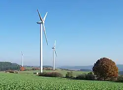 Germany is rich in timber, lignite, potash, and salt. Some minor sources of natural gas are being exploited in the state of Lower Saxony. Until German reunification, the German Democratic Republic mined for uranium in the Ore Mountains (see also: SAG/SDAG Wismut). Energy in Germany is sourced predominantly by fossil fuels (30%), with wind power in second place, then gas, solar, biomass (wood and biofuels), and hydro.[36] Germany is the first major industrialised nation to commit to the renewable energy transition called Energiewende. Renewables produced 46% of electricity consumed in Germany (as of 2019).[37] Germany has been called "the world's first major renewable energy economy".[38][39] Germany has the world's second-largest gold reserve, with over 3,000 tonnes of gold.[40] As of 2023, Germany spends around 3.1% of GDP, third among major economies, on research and development.[41][42] It is also the world's second-largest high-technology exporter and ranks in the top 10 of countries by stock market capitalization.[43][44] During the 2020s, Germany faced significant economic troubles.