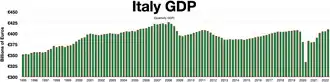 Starting from February 2020, Italy was the first country of Europe to be severely affected by the COVID-19 pandemic,[92] that eventually expanded to the rest of the world. The economy suffered a massive shock as a result of the lockdown of most of the country's economic activity. After three months, at the end of May 2020, the pandemic was put under control, and the economy started to recover, especially, the manufacturing sector. Overall, it remained surprisingly resilient, although GDP plummeted like in most western countries.[93][94] The Italian government issued special treasury bills, known as BTP Futura[95] as a COVID-19 emergency funding, waiting for the approval of the E.U. response to the outbreak.[96] Eventually, in July 2020, the European Council approved the 750 billion € Next Generation EU fund,[97] of which €209 billion will go to Italy.[98]