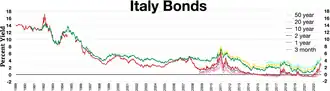 Italy was among the countries hit hardest by the Great Recession of 2008–2009 and the subsequent European debt crisis. The national economy shrunk by 6.76% during the whole period, totaling seven-quarters of recession.[84] In November 2011 the Italian bond yield was 6.74 per cent for 10-year bonds, nearing a 7 per cent level where Italy is thought to lose access to financial markets.[85] According to Eurostat, in 2015 the Italian government debt stood at 128% of GDP, ranking as the second biggest debt ratio after Greece (with 175%).[86] However, the biggest chunk of Italian public debt is owned by Italian nationals and relatively high levels of private savings and low levels of private indebtedness are seen as making it the safest among Europe's struggling economies.[87][88] As a shock therapy to avoid the debt crisis and kick-start growth, the national unity government led by the economist Mario Monti launched a program of massive austerity measures, that brought down the deficit but precipitated the country in a double-dip recession in 2012 and 2013, receiving criticism from numerous economists.[89][90]
