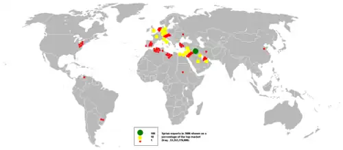 Agriculture is a high priority in Syria's economic development plans, as the government seeks to achieve food self-sufficiency, increase export earnings, and halt rural out-migration.[64] Thanks to sustained capital investment, infrastructure development, subsidies of inputs, and price supports, before the civil war Syria went from a net importer of many agricultural products to an exporter of cotton, fruits, vegetables, and other foodstuffs. One of the prime reasons for this turnaround was the government's investment in huge irrigation systems in northern and northeastern Syria.[65] The agriculture sector, as of 2009, employed about 17% of the labor force and generates about 21% of the gross domestic product,[66][67] of which livestock accounted for 16%, and fruit and grains for more than 40%.[64]