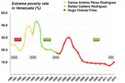 By late 1991, as part of the economic reforms, Carlos Andrés Pérez' administration had sold three banks, a shipyard, two sugar mills, an airline, a telephone company and a cell phone band, receiving a total of US$2,287 million.[70] The most remarkable auction was CANTV's, a telecommunications company, which was sold at the price of US$1,885 million to the consortium composed of American AT&T International, General Telephone Electronic and the Venezuelan Electricidad de Caracas and Banco Mercantil. The privatization ended Venezuela's monopoly over telecommunications and surpassed even the most optimistic predictions, with over US$1,000 million above the base price and US$500 million more than the bid offered by the competition group.[71] By the end of the year, inflation had dropped from 84% in 1989 to 31%,[57] Venezuela's international reserves were now worth US$14,000 million and there was an economic growth of 9% (called as an "Asian growth"), the largest in Latin America at the time.[70][72][73][74] While foreign debtors were repaid and the economy grew, by 1992, the majority of economic benefits were experienced by the upper class while middle to lower classes faced increased poverty and high unemployment rates between ten and forty percent.[72][75][76]