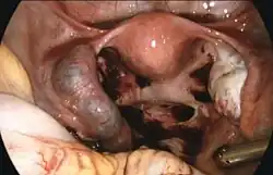 Women with pelvic inflammatory disease (PID) have a high occurrence of ectopic pregnancy.[27] This results from the build-up of scar tissue in the fallopian tubes, causing damage to the cilia.[28] However, if both tubes were completely blocked, so that sperm and egg were physically unable to meet, then fertilization of the egg would naturally be impossible, and neither normal pregnancy nor ectopic pregnancy could occur. Intrauterine adhesions (IUA) present in Asherman's syndrome can cause ectopic cervical pregnancy or, if adhesions partially block access to the tubes via the ostia, ectopic tubal pregnancy.[29][30][31] Asherman's syndrome usually occurs from intrauterine surgery, most commonly after D&C.[29] Endometrial/pelvic/genital tuberculosis, another cause of Asherman's syndrome, can also lead to ectopic pregnancy as infection may lead to tubal adhesions in addition to intrauterine adhesions.[32]