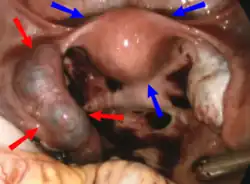 | Laparoscopic view, looking down at the uterus (marked by blue arrows). In the left fallopian tube, there is an ectopic pregnancy and bleeding (marked by red arrows). The right tube is normal. | |