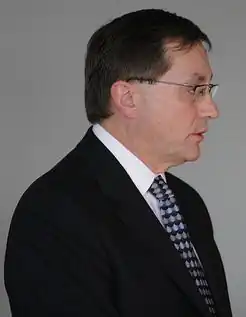 After the 1997 provincial election, Klein appointed Stelmach Minister of Agriculture, Food, and Rural development.[13] While he held this office, his department encouraged the establishment of feedlots.[10] The opposition parties charged that the government was not regulating these sufficiently, but Stelmach responded that municipalities had the authority necessary to effectively regulate them.[10] On the Canadian Wheat Board controversy, Stelmach sided with farmers who wanted an end to the federal body's monopoly on grain sales in the western provinces.[10] Legislatively, Stelmach sponsored five bills while in the Agriculture, Food, and Rural Development portfolio, all of which passed through the legislature.[14][15] 1997's Meat Inspection Amendment Act required meat inspectors to acquire a search warrant before entering a private dwelling, but also allowed for fines to be voluntarily paid without requiring a court case.[16] It was called by Liberal agriculture critic Ken Nicol "a really good bill".[16] The Livestock and Livestock Products Amendment Act of the same year eliminated government guarantee of the Livestock Patrons' Assurance Fund, designed to protect cattle producers from payment defaults by livestock dealers, in favour of leaving the Fund entirely in the hands of the industry.[17] It too was supported by the Liberals, with Nicol calling it "very easy for us to accept".[18] In 1998, Stelmach sponsored the Agriculture Statutes (Penalties) Amendment Act, which overhauled the penalty system for violation of various agricultural statutes, setting maximum fines and leaving the precise amount up to judges on a case-by-case basis.[19] It also passed with Liberal support, as MLA Ed Gibbons said that it "really makes a lot of sense".[19] Another 1998 bill was the Marketing of Agricultural Products Amendment Act, which allowed provincial agricultural marketing boards to revise their marketing plans, and was supported by the opposition.[19] Finally, Stelmach initiated the Agriculture Statutes (Livestock Identification) Amendment Act, which allowed the government to delegate the inspection of branding to the cattle industry.[20] The bill was the subject of considerable debate on second reading,[20] but was ultimately supported by the Liberals on the third and final reading.[21]
