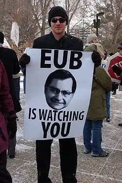 In June 2007, the government-mandated Alberta Energy and Utilities Board admitted that it had hired private investigators to spy on landowners who opposed the construction of a major power line in the Rimbey area.[67] Stelmach initially downplayed the incident, but ordered a judicial investigation once the province's Information and Privacy Commissioner initiated an investigation of his own.[68] This investigation found that the EUB had violated provincial law and infringed on the landowners' privacy, while the judicial investigation criticized the EUB's tactics as "repulsive". The opposition parties called for the dismissal of the entire EUB and Energy Minister Mel Knight; Stelmach instead opted to appoint a new EUB chair.[69]