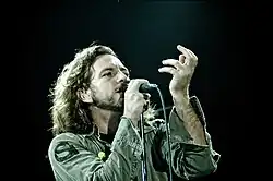Music critic Jim DeRogatis has described Vedder's vocals as a "Jim Morrison-like vocal growl".[96] Greg Prato of AllMusic said, "With his hard-hitting and often confessional lyrical style and Jim Morrison-esque baritone, Vedder also became one of the most copied lead singers in all of rock."[97] Vedder has inducted Aerosmith, the Doors, Neil Young, the Ramones, and R.E.M. into the Rock and Roll Hall of Fame, and in his induction speeches he has cited them all as influences. Other influences that Vedder has cited include Pete Townshend and the Who, which the singer considers to be his favorite band of all time,[98] the Beatles, Bruce Springsteen, Pink Floyd, Talking Heads, Fugazi, and the Clash.[99][100][101]