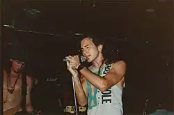 In the 1980s, Vedder worked part time as a night clerk at a local gas station.[20] Through the Southern California music scene, Vedder met former Red Hot Chili Peppers drummer Jack Irons, who became a friend and would play basketball with him.[21] Later in 1990, Irons gave him the demo tape of a Seattle band looking for a singer. Vedder listened to the tape shortly before going surfing, where lyrics came to him.[22] He wrote lyrics for three of the songs in what he later described as a "mini-opera" entitled Momma-Son. The songs tell the story of a young man who, like Vedder, learns that he had been lied to about his paternity and that his real father is dead, grows up to become a serial killer, and is eventually imprisoned and sentenced to death.[22] Vedder recorded vocals for the three songs, and mailed the demo tape back to Seattle. The three songs would later become Pearl Jam's "Alive", "Once", and "Footsteps".