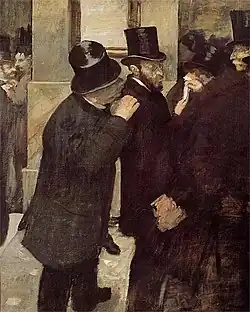 In the 1870s, Degas gravitated towards the republican circles of Léon Gambetta.[69] However, his republicanism did not come untainted, and signs of the prejudice and irritability which would overtake him in old age were occasionally manifested. He fired a model upon learning she was Protestant.[68] Although Degas painted a number of Jewish subjects from 1865 to 1870, his 1879 painting Portraits at the Stock Exchange may be a watershed in his political opinions. The painting is a portrait of the Jewish banker Ernest May—who may have commissioned the work and was its first owner—and is widely regarded as anti-Semitic by modern experts. The facial features of the banker in profile have been directly compared to those in the anti-Semitic cartoons rampant in Paris at the time, while those of the background characters have drawn comparisons to Degas' earlier work Criminal Physiognomies.[70][71]