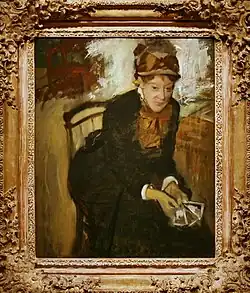 Mlle. Fiocre in the Ballet La Source, exhibited in the Salon of 1868, was his first major work to introduce a subject with which he would become especially identified, dancers.[44] In many subsequent paintings, dancers were shown backstage or in rehearsal, emphasizing their status as professionals doing a job. From 1870 Degas increasingly painted ballet subjects, partly because they sold well and provided him with needed income after his brother's debts had left the family bankrupt.[45] Degas began to paint café life as well, in works such as L'Absinthe and Singer with a Glove. His paintings often hinted at narrative content in a way that was highly ambiguous; for example, Interior (which has also been called The Rape) has presented a conundrum to art historians in search of a literary source—Thérèse Raquin has been suggested[46]—but it may be a depiction of prostitution.[47]